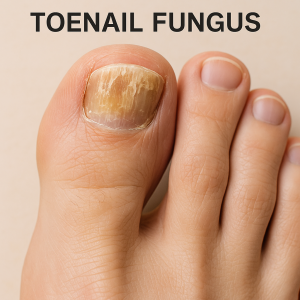 Toenail fungus, medically known as Onychomycosis, is a common nail infection that affects the toenails more often than the fingernails. Signs include yellowing or whitening of the nail, thickening, brittleness, splitting, or lifting of the nail from its bed.